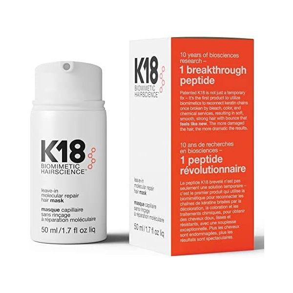K18 is made with a patented peptide which helps to repair the links between keratin cells, and because you don’t rinse it out, that effect continues after you’ve applied.